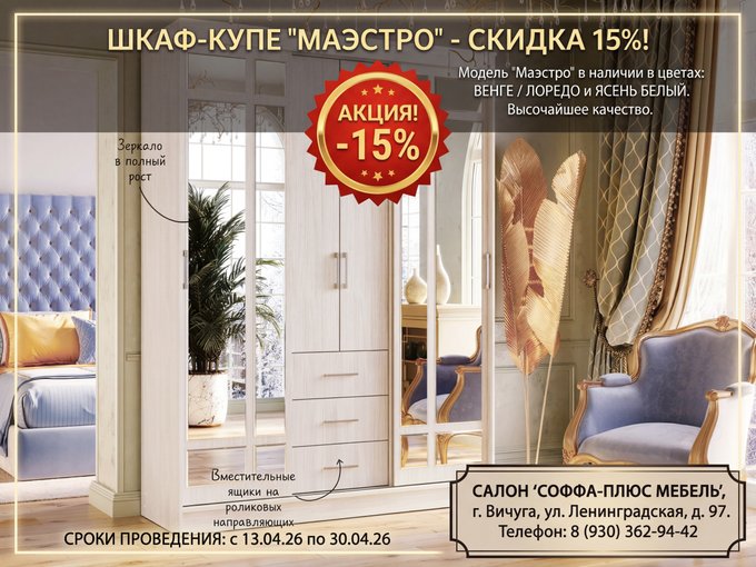 Шкаф‑купе «Маэстро» со скидкой 15%!
